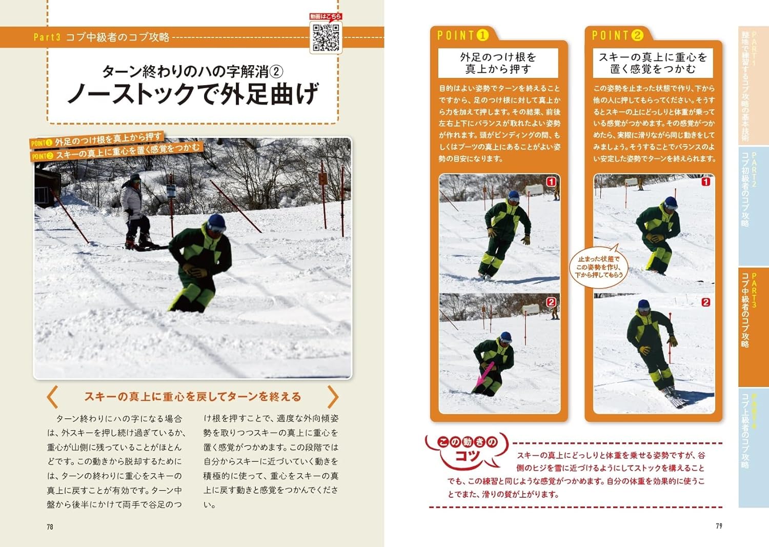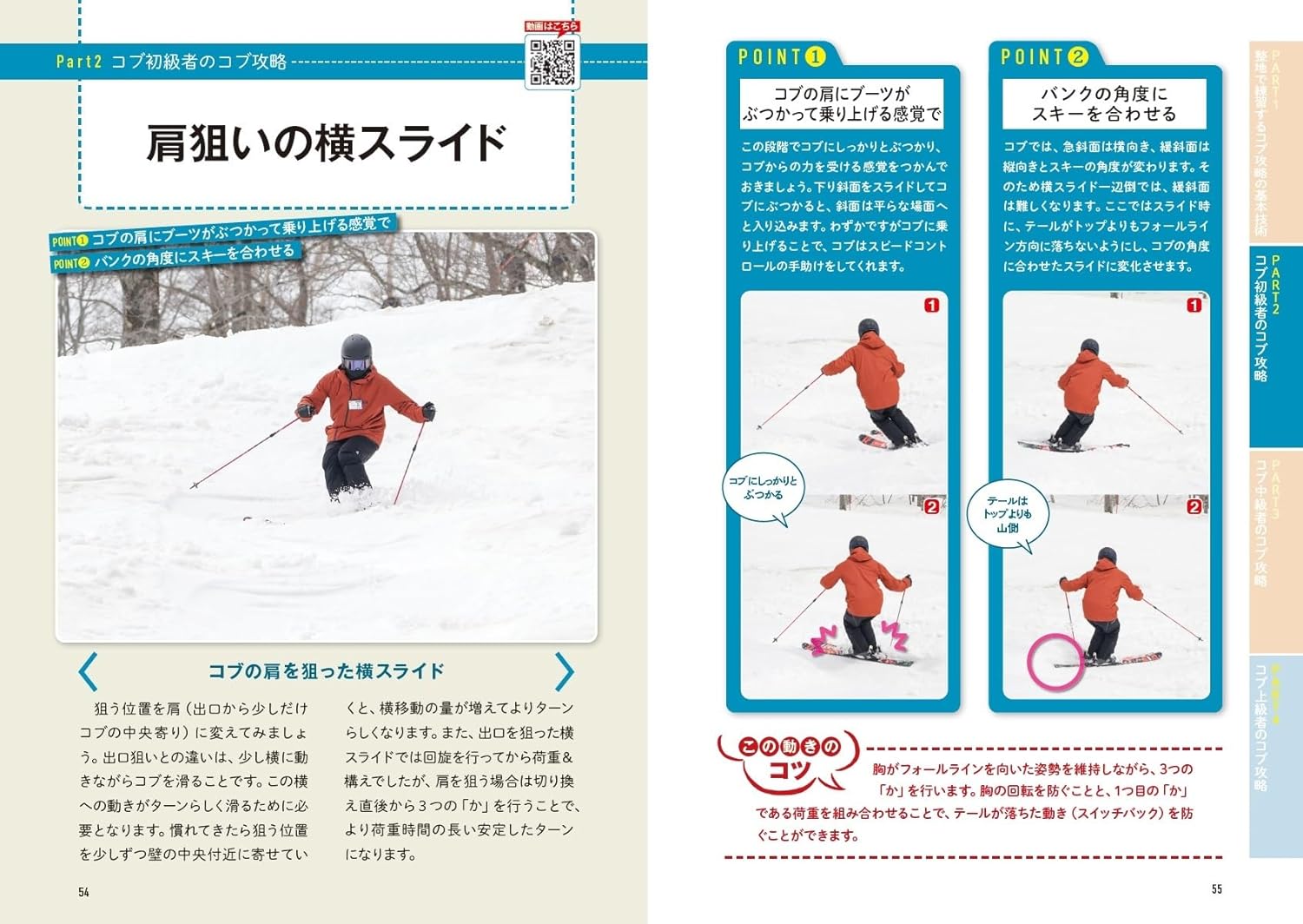 コブ初心者から上級者までレベルに応じた滑り方の紹介や、ケーススタディ、具体的な練習方法などが文章や画像に加え、動画も含め解説されています。