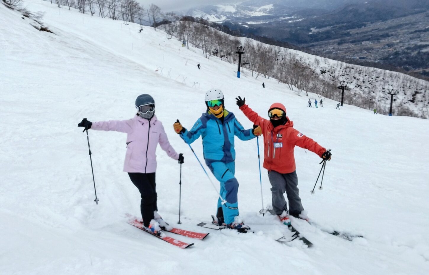谷スキーの真上から重さを乗っけて、足を突っ張らないように、傾きと重さの進行と、捻りで停止が出来るように精度を高めて行きましょうね。