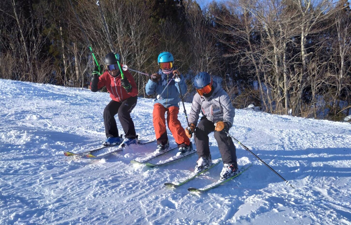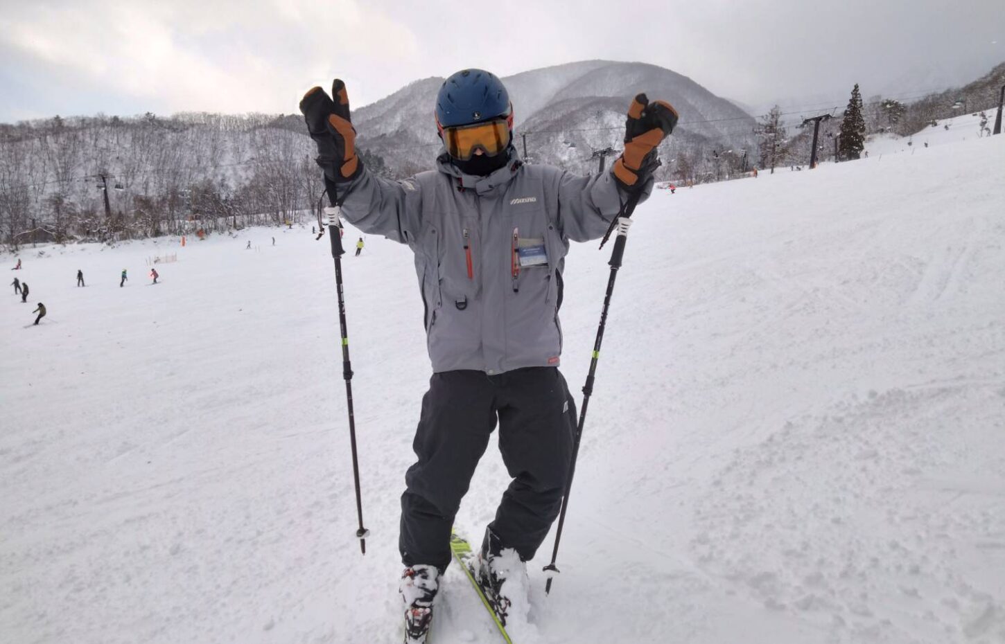 ストックを束ねて両手で持ち、身体の側方にストック真っ直ぐ立てました。両腕とストックで出来たDのような形を斜面下で見ている人に、しっかり見せるようにしましょう。